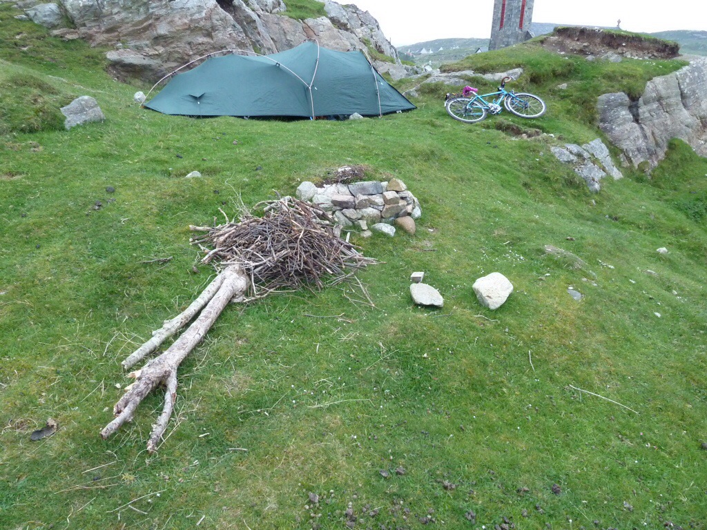 By now the wind and rain was really setting in, so I chose a sheltered spot behind a rocky outcrop and pitched as quickly as I could. The Man from the bar appeared again, ostensibly offering assistance (politely declined) but I suspect to see with his own eyes, a woman pitching a tent without male assistance and hopefully prove his prejudices to be correct as I was sure to make mistake after mistake. I am sure he didn’t believe I could possibly do it without something going wrong and I was almost certain that, the usually simple job I can do in a few hitch free minutes would, on this occasion, be hampered by all sorts of problems, just because he was watching. However, this proved not to be the case and the tent was up, the Trangia out and boiling water, and tea made and offered to him in possibly the shortest amount of time I have ever done it. Result!>
